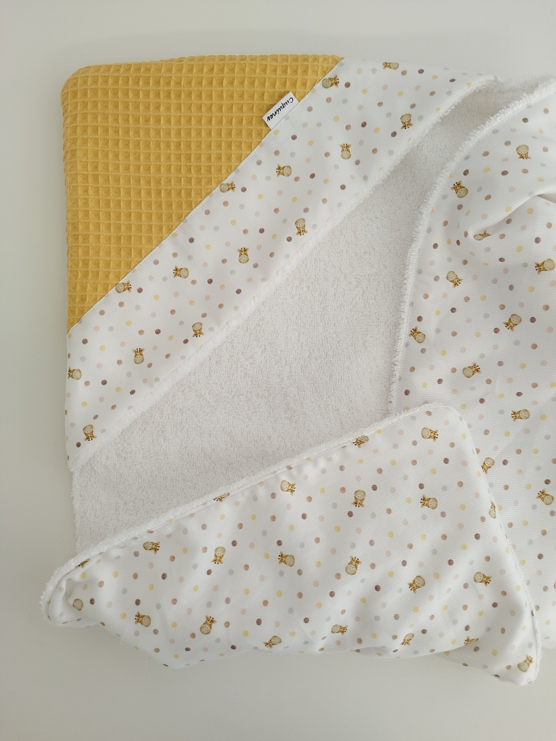 Por un lado, encontrarás una toalla de rizo suave y absorbente, perfecta para secar a tu bebé tras el baño. En la parte trasera, una preciosa tela estampada de algodón 100%, que convierte esta capa de baño en un producto bonito, funcional y lleno de mimo.