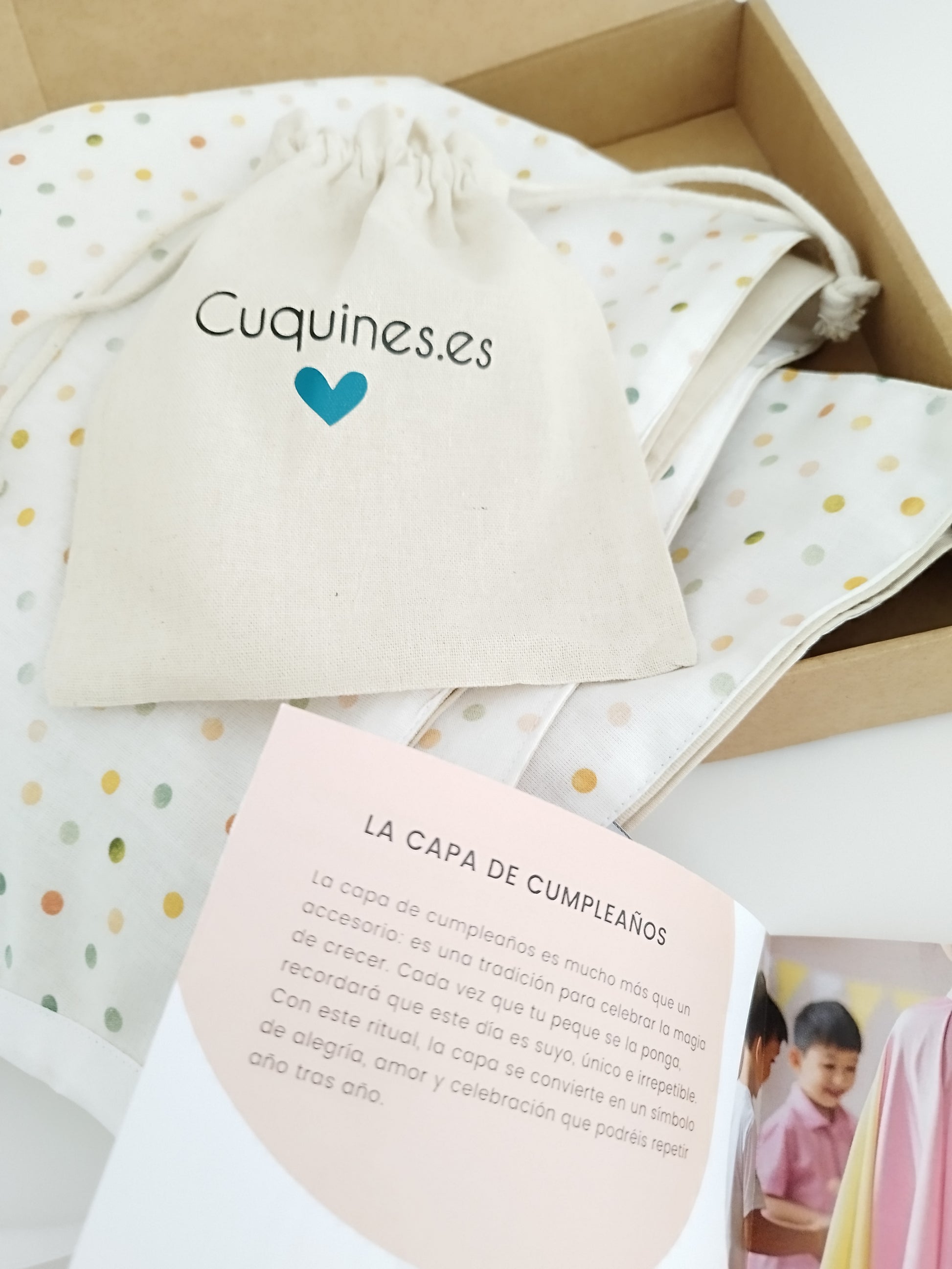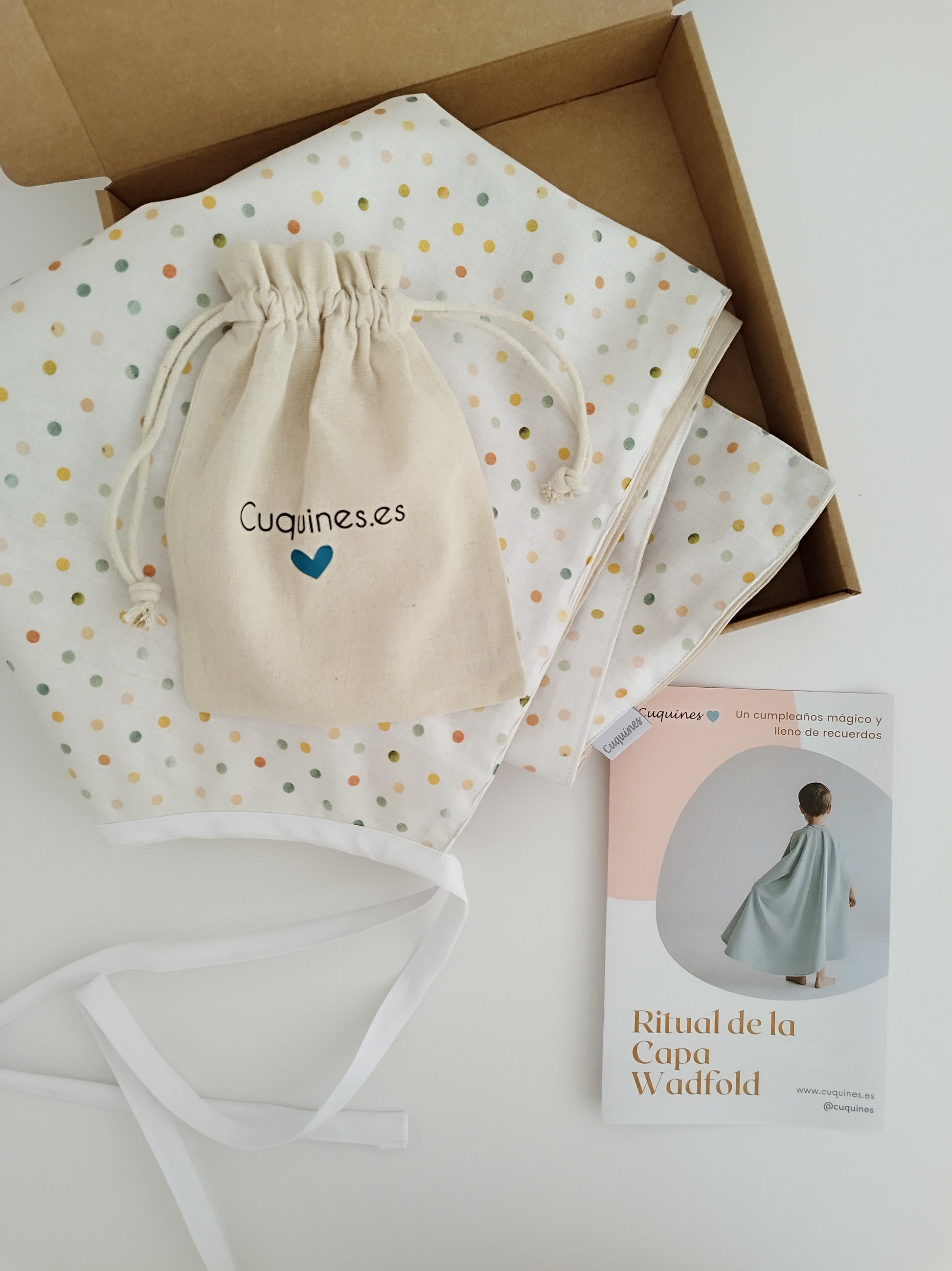 Inspirada en la pedagogía Waldorf, esta capa se coloca sobre los hombros del niño o niña en su día especial, envolviéndolo en un ambiente mágico. Con ella, se convierte en el protagonista de un ritual lleno de significado: se narra su historia de vida, se le dedican deseos, y cada año se cose un parche que representa algo único de ese ciclo vivido.