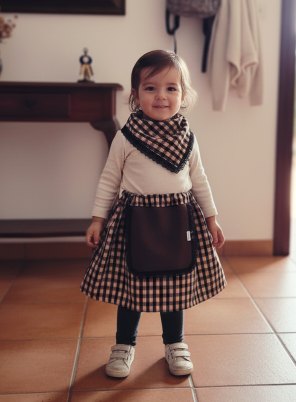 ¡Atención, mamás y papás! Si buscáis el outfit perfecto para que vuestra peque sea la más original y adorable en la Castañada, ¡esta falda con delantal incorporado es un flechazo seguro! Es el dos en uno que estabais esperando para celebrar el otoño con mucho estilo y tradición. Detalle de puntilla en delantal y pañoleta.