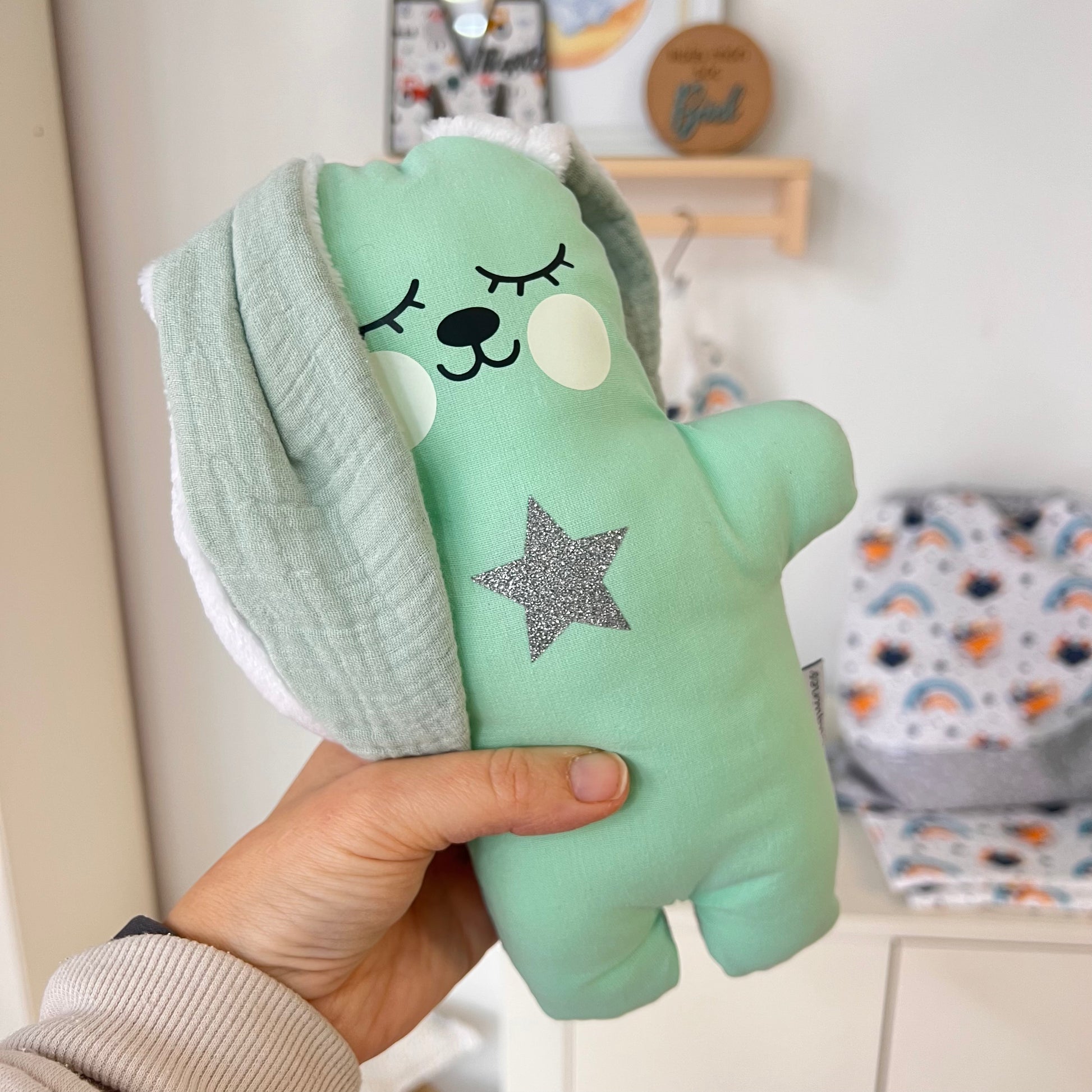 Descubre a Luci, nuestro peluche suave para bebé hecho a mano en el taller de Cuquines, con un detalle único que enamora: sus mofletes fluorescentes que brillan suavemente en la oscuridad.